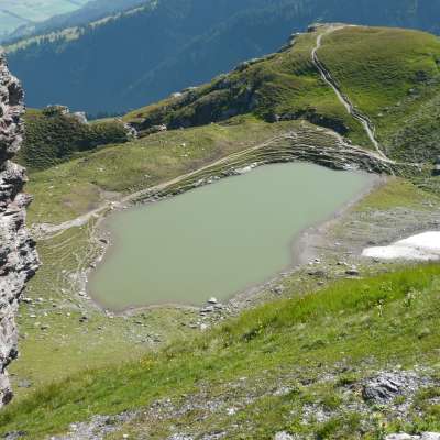 Vous vous trouvez devant le lac Baschalva aux reflets verts. Ici aussi, vous trouverez beaucoup de force, mais il n'y a pas que des énergies constructives. D'un point de vue énergétique, les valeurs du lac Baschalva atteignent celles d'un lieu de culte. On ne sait pas s'il a été utilisé comme tel. En été, des vaches y paissent et, debout dans l'eau peu profonde, elles rappellent des peintures très anciennes. C'est une image de paix qui se présente à vous dans cette montagne idyllique.
