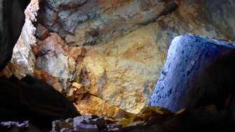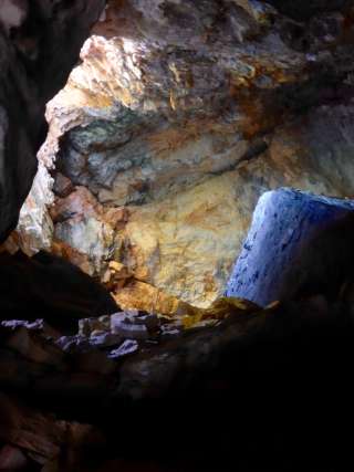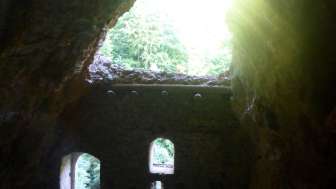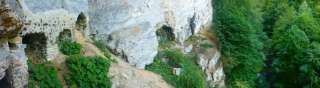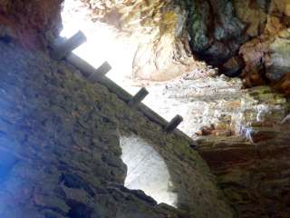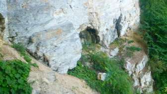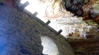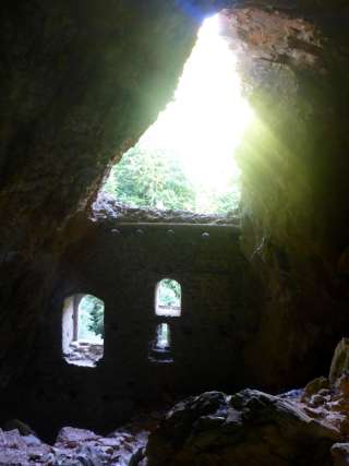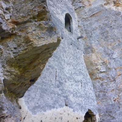 Château troglodytique. Mur solide avec meurtrières et entrée haute. Des restes de poutres en bois marquent l'emplacement des arcades et des escaliers extérieurs menant à l'entrée haute. Souches de poutres sur le couronnement du mur d'une construction de toit ou d'une superstructure en bois. Intérieur de la grotte en grande partie rempli de débris rocheux. Une brèche étroite au pied du mur extérieur permet d'escalader l'intérieur de la grotte.