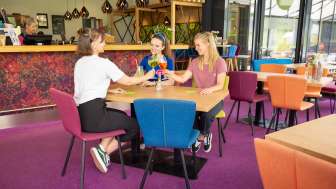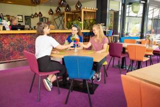 Le bar COLORS avec service dispose de 56 places à l'intérieur. Outre une offre de boissons colorées, il propose le petit-déjeuner le matin et des snacks tendance l'après-midi.