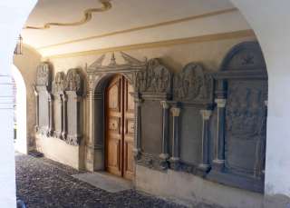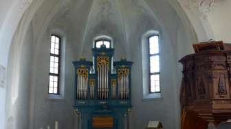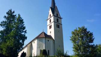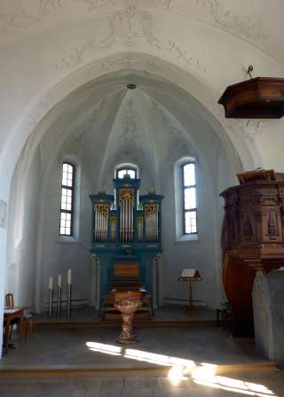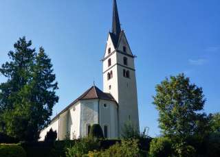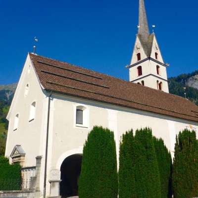 On suppose que la première église date des 7e et 8e siècles. Le clocher élancé s'appuie sur l'imposante nef de style gothique tardif. Des inscriptions funéraires des familles nobles de Gugelberg, de Planta et de Salis ornent le mur ouest de l'avant-corps en forme d'arcade, à l'intérieur comme à l'extérieur. Un style baroque tardif sobre caractérise l'intérieur. La sonnerie comprend cinq cloches depuis 1961, deux en 1788.