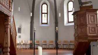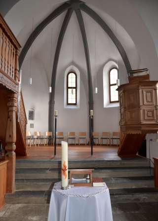 L'église se blottit contre la colline du château, trouvant un abri pour elle-même et ses visiteurs. Les façades presque entièrement fermées au nord et à l'ouest renforcent cette impression. Le chœur gothique sacré dialogue avec la nef, dominée par des éléments en bois. La tribune placée au nord et à l'ouest a été construite en raison du manque de possibilités d'extension.