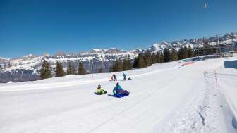 Le plaisir de la luge pour les enfants à Prodalp : située à côté du télésiège, cette descente plate permet aux enfants de glisser en toute sécurité avec un bob ou une luge des neiges.