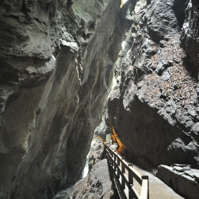 Passez devant les anciens bains de Pfäfers et entrez dans les gorges en passant par le tourniquet (entrée/jet de pièce). En empruntant la passerelle le long de la paroi, vous arriverez à la galerie qui vous mènera à la source Paracelsus. À l'entrée de la galerie, remarquez la statue de Sainte-Barbe, patronne des mineurs.