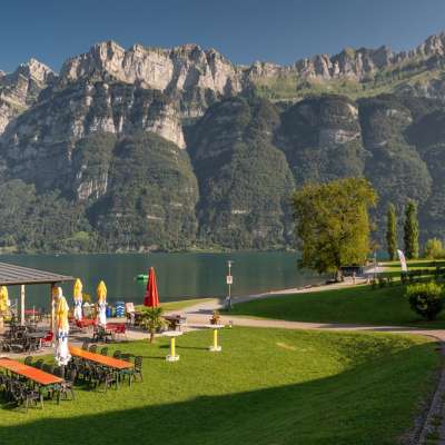 La station balnéaire est située à Unterterzen sur le site du Resort Walensee et est idéale pour se faire bronzer pendant les chaudes journées d'été. Une vaste pelouse, un kiosque de plage pour calmer la faim et une plage de galets assurent la convivialité. Un foyer ouvert offre une expérience de grillade optimale pour les jeunes et les moins jeunes.