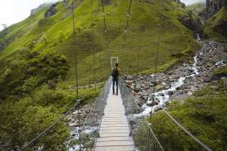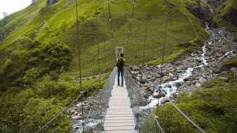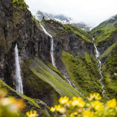 Ils se trouvent devant les chutes du Piltschinabach (à gauche), hautes de 81 mètres, celles du Sässbach (86 m de haut, au milieu) et celles du Muttenbach (45 m de haut, à droite). Un peu plus haut, le Lavtinabach se jette dans le Piltschinabach et un peu plus bas, le Guetentalbach se jette dans le Gufelbach. Vous vous trouvez dans un lieu de force hydraulique à cinq bras, qui a été érodé pour former une arène rocheuse imposante. La vue n'est pas la seule à être époustouflante, les énergies sont également extrêmement élevées et stimulantes.